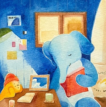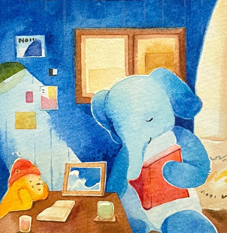 以前有一隻大象娃娃在角落,看著很療癒所以畫了這兩幅作品,其中一幅有衝浪板是因為店裡的裝飾,