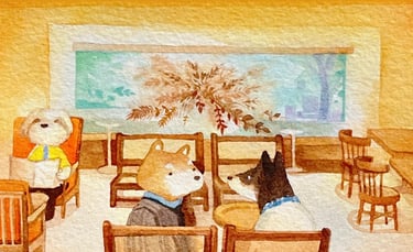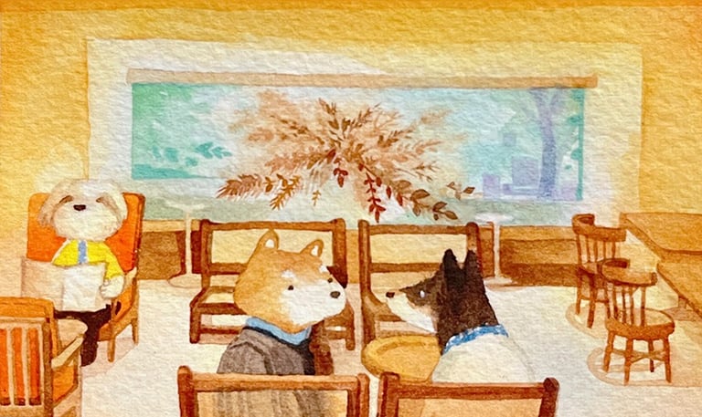第一次去勺日的時候,我在二樓的座位區,附近的位置剛好有兩隻柴犬,一黑一棕,